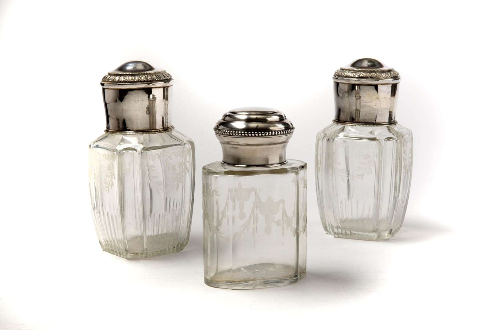 Deux flacons en cristal à décor gravé de festons fleuris, le bouchon en ar