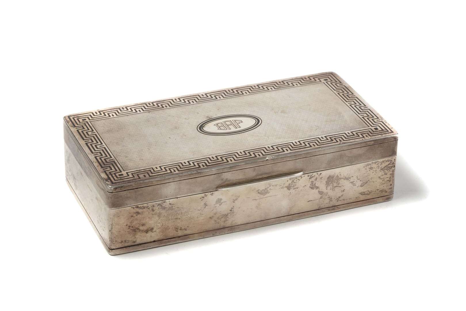 Boite rectangulaire en argent à décor guilloché et encadrement de frise géométrique, inscription BAP dans un ovale