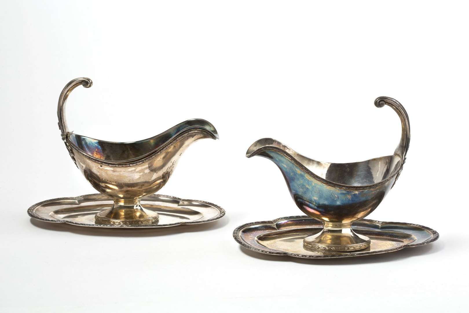 Paire de saucières en argent, le plateau polylobé chiffré, anse à enroulem