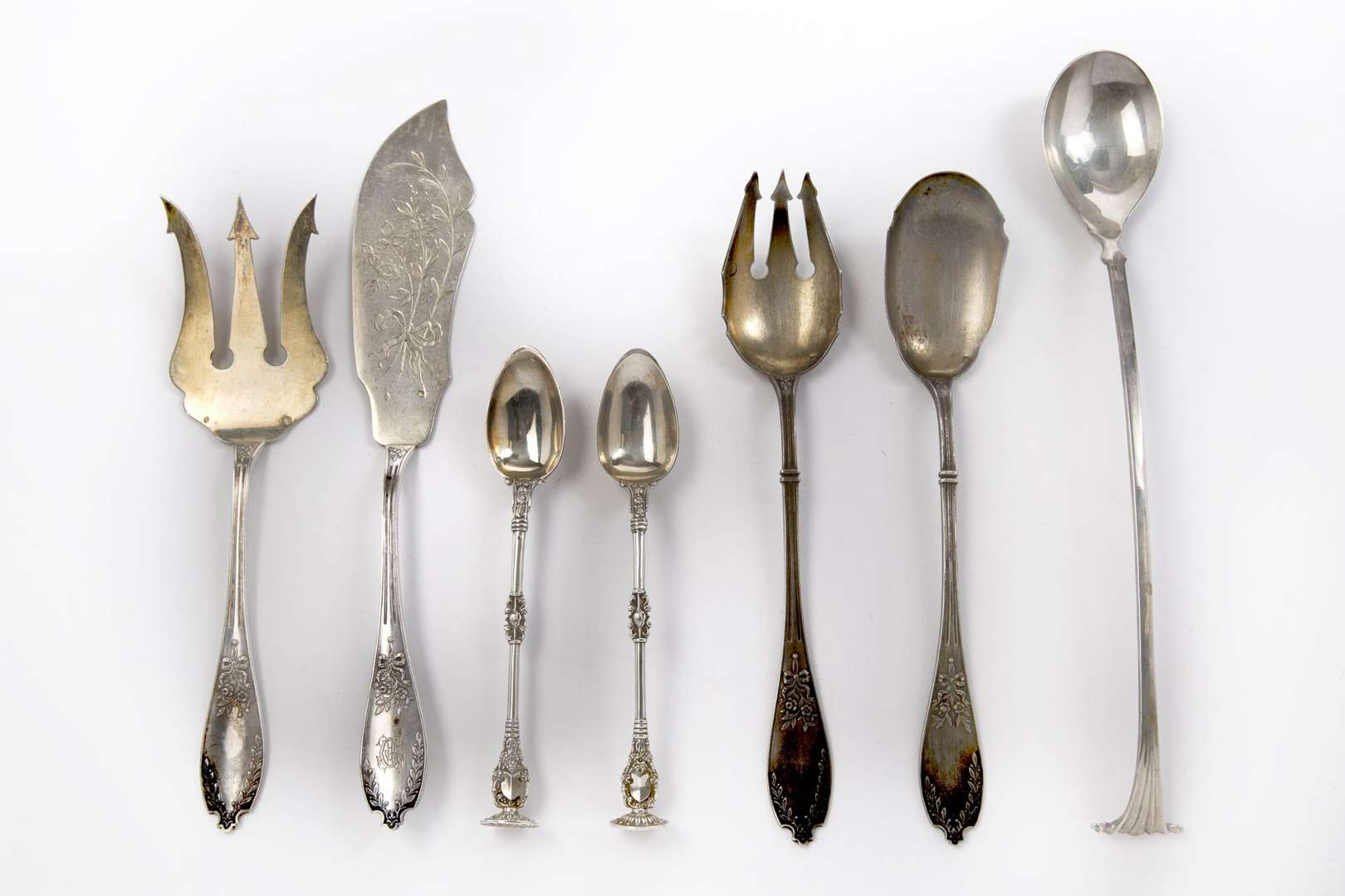 Couverts de service à salade et couverts à poisson à spatule fleurie, poinçon d'orfèvre Joseph CROSSARD