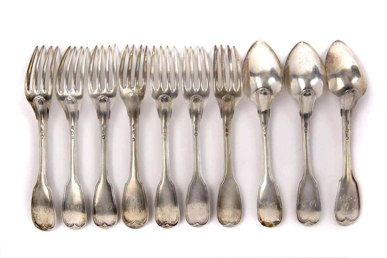 Suite de sept grandes fourchettes et trois grandes cuillères en argent modèle filet, spatule chiffrée
