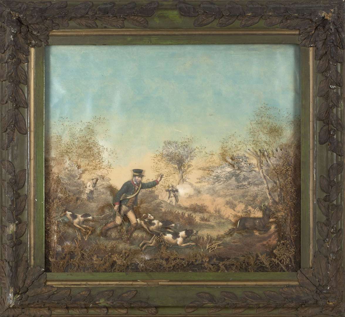 Diorama représentant une chasse à cour au cerf, encadré sous verre