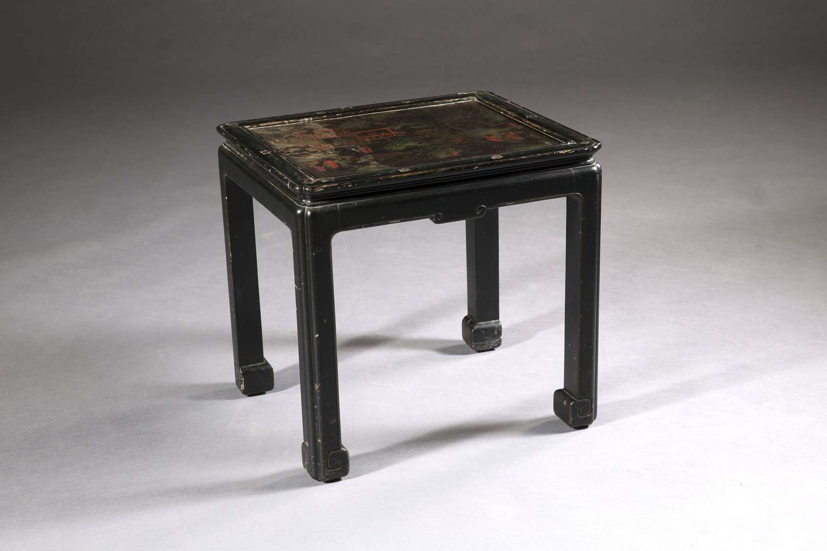 CHINE, petite table basse en bois laqué noir, le plateau à décor d'un pays