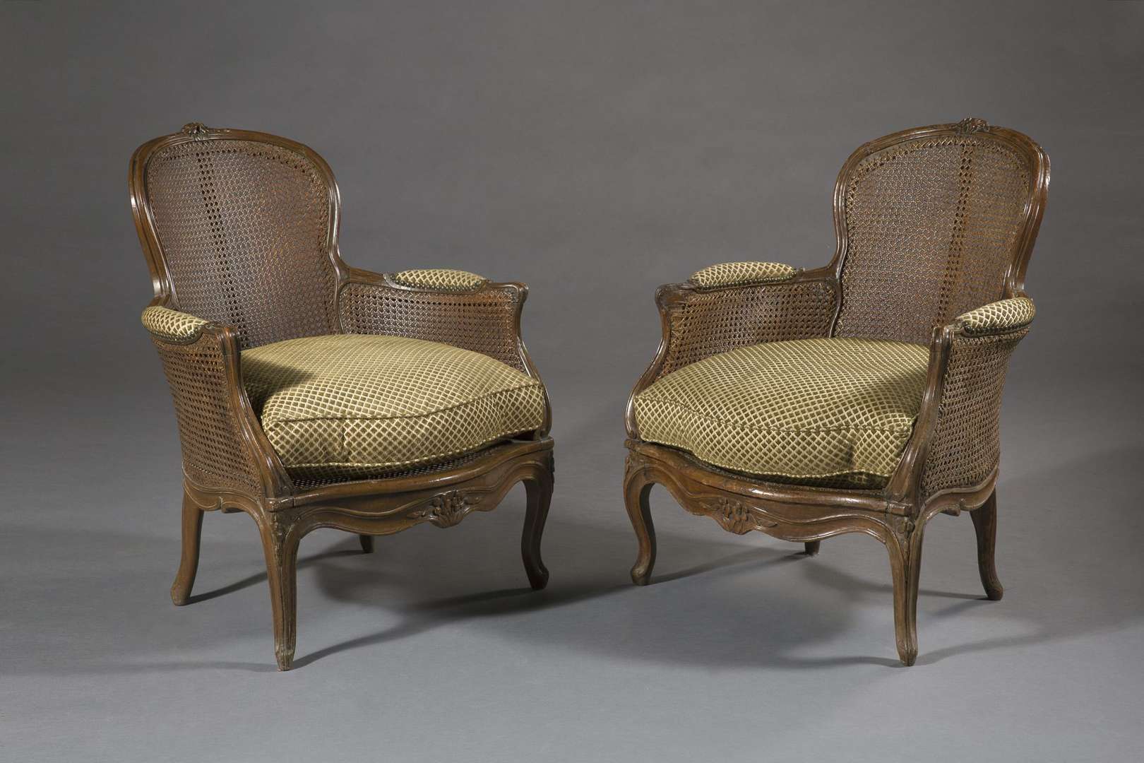 Réunion de deux bergères en noyer mouluré et sculpté à dossiers et assises cannés, accotoirs à manchettes.
