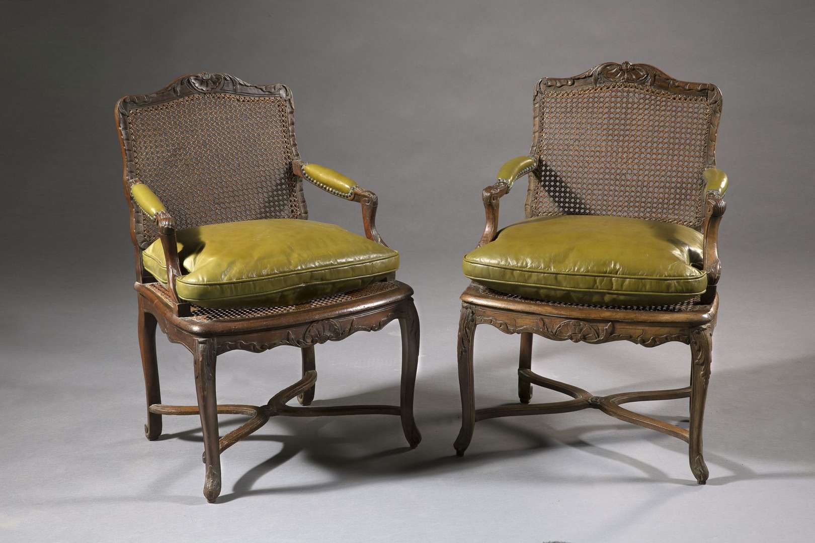Deux fauteuils cannés en bois sculpté et mouluré, de modèles similaires po
