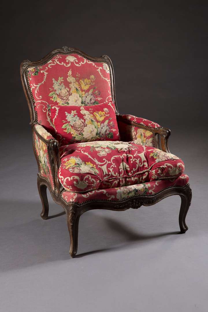 Bergère galbée en hêtre sculpté et mouluré, le dossier en chapeau de genda