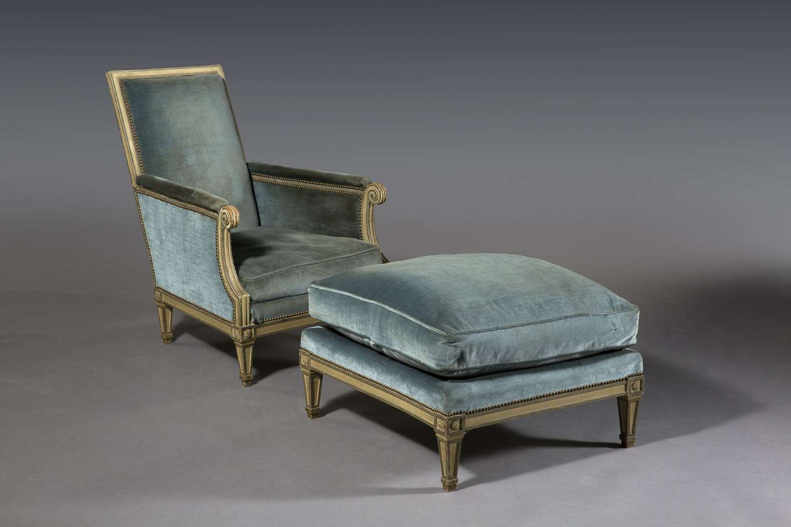 Duchesse brisée à dossier droit carré en hêtre mouluré, sculpté et laqué gris, accotoirs à crosses, supports d'accotoirs cannelés reliés aux pieds fuselés à section carrée par un dé de raccordement à fleurettes