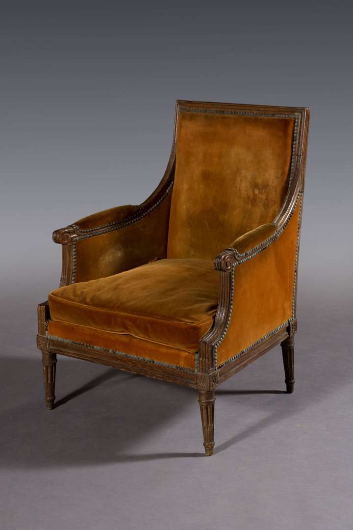 Bergère chauffeuse en hêtre mouluré et sculpté, les accotoirs à enroulement, pieds cannelés et rudentés