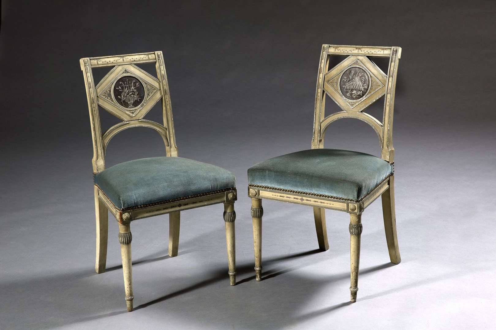 Paire de chaises en hêtre mouluré, sculpté et laqué gris, le dossier ajouré renversé à décor d'instruments de musiques dans un médaillon, pieds antérieurs balustres, pieds postérieurs en sabre