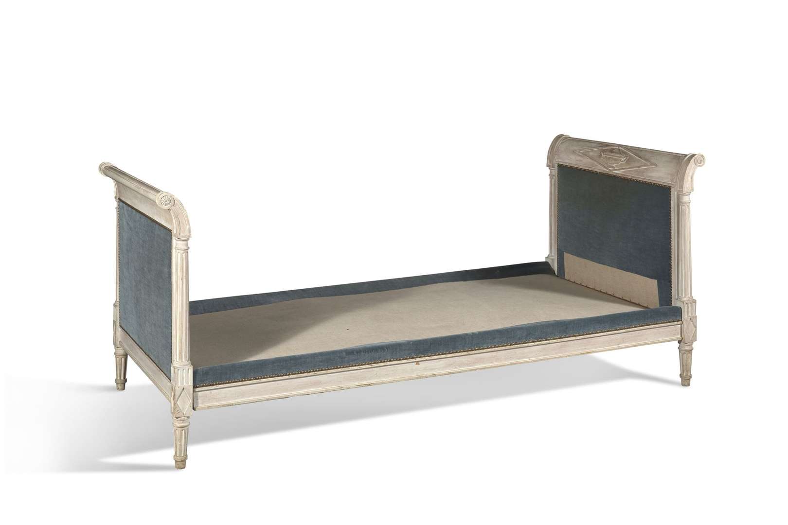 Lit en bois mouluré, sculpté et laqué gris à décor de vases à l'antique dans des losanges, montants formant colonnes détachées et pieds cannelés