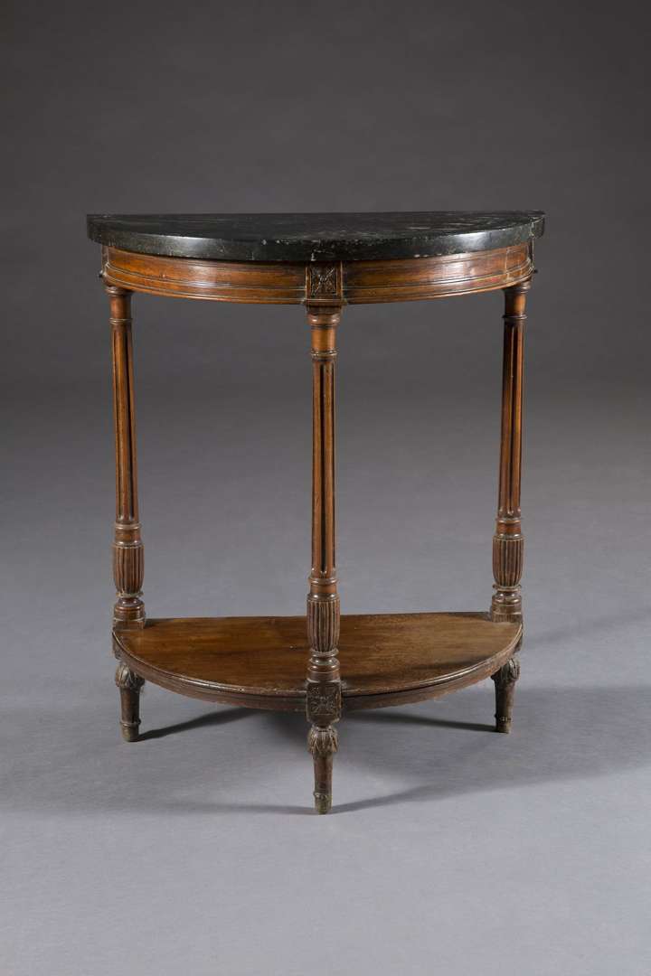Petite console tripode de forme demi-lune, les pieds cannelés réunis par une tablette d'entretoise