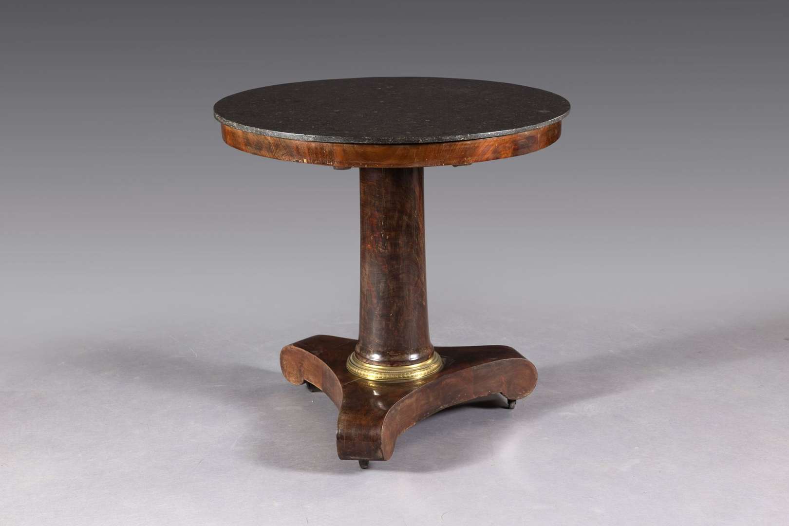 Guéridon tripode en acajou, le fut formant colonne, les pieds supportés pa