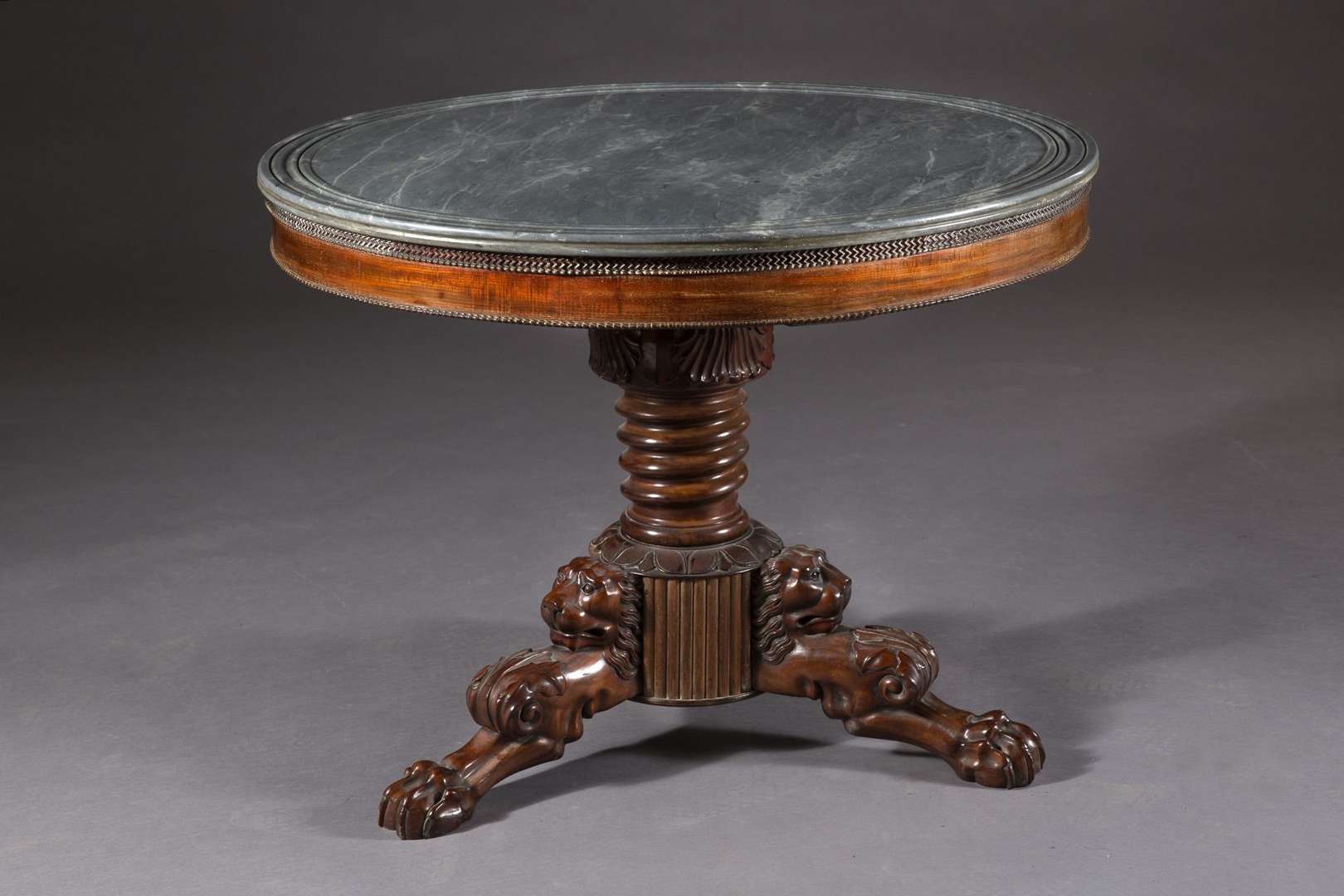 Guéridon en acajou et placage d'acajou à piètement tripode formé de mufles et pattes de lion. Plateau de marbre bleu turquin mouluré