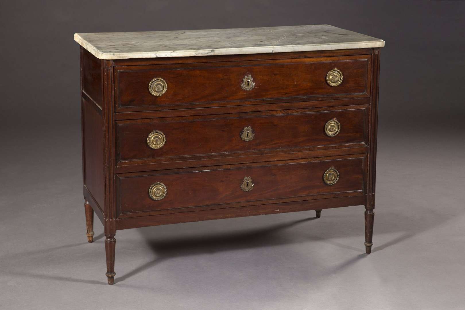 Commode en placage d'acajou ouvrant à trois tiroirs, montants cannelés rudentés, pieds balustres annelés, dessus de marbre gris