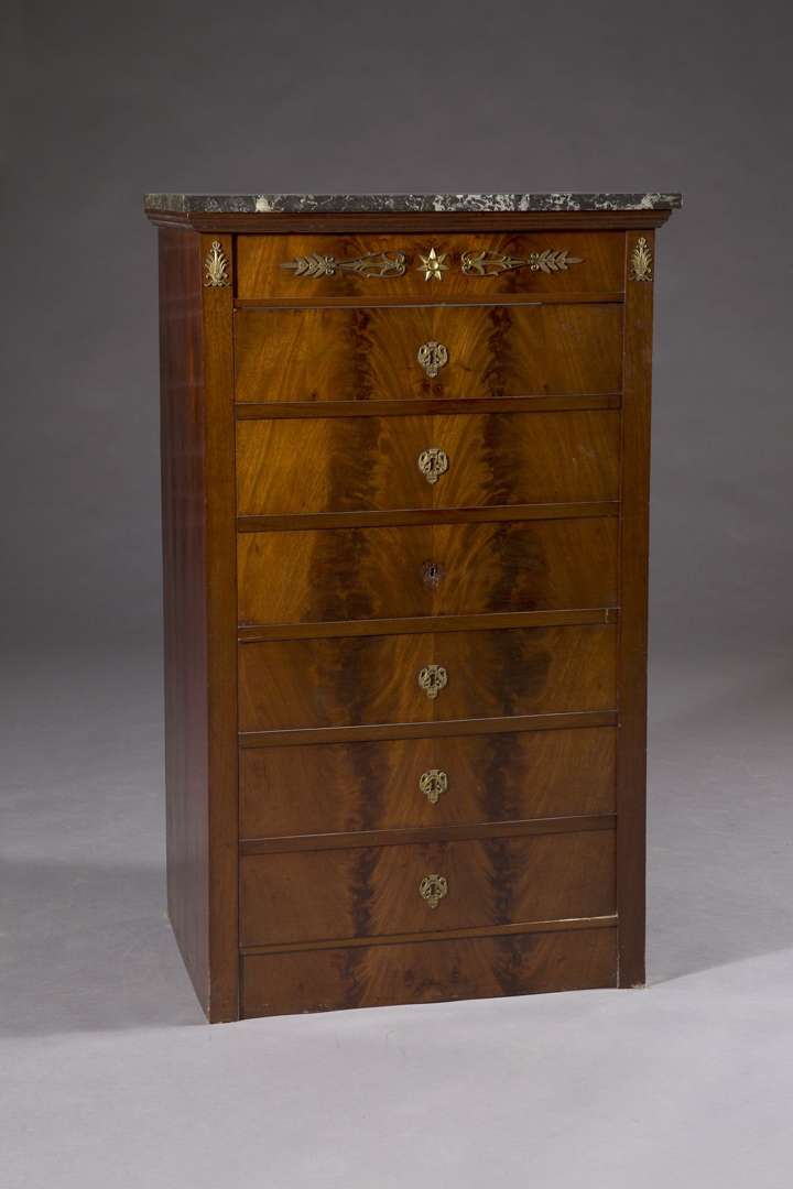 Rare meuble formant cache coffre fort en placage d'acajou dans le style Empire, dessus de marbre noir veiné