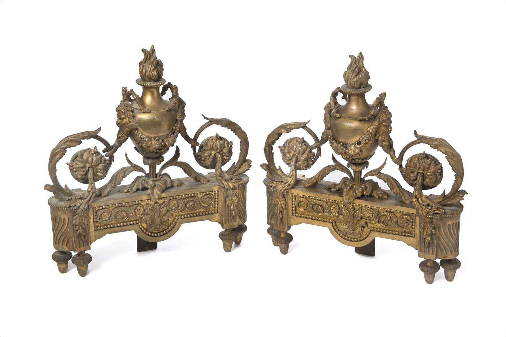 Paire de chenêts en bronze ciselé et doré de style Louis XVI à riche décor de vase flammé et rinceaux fleuris