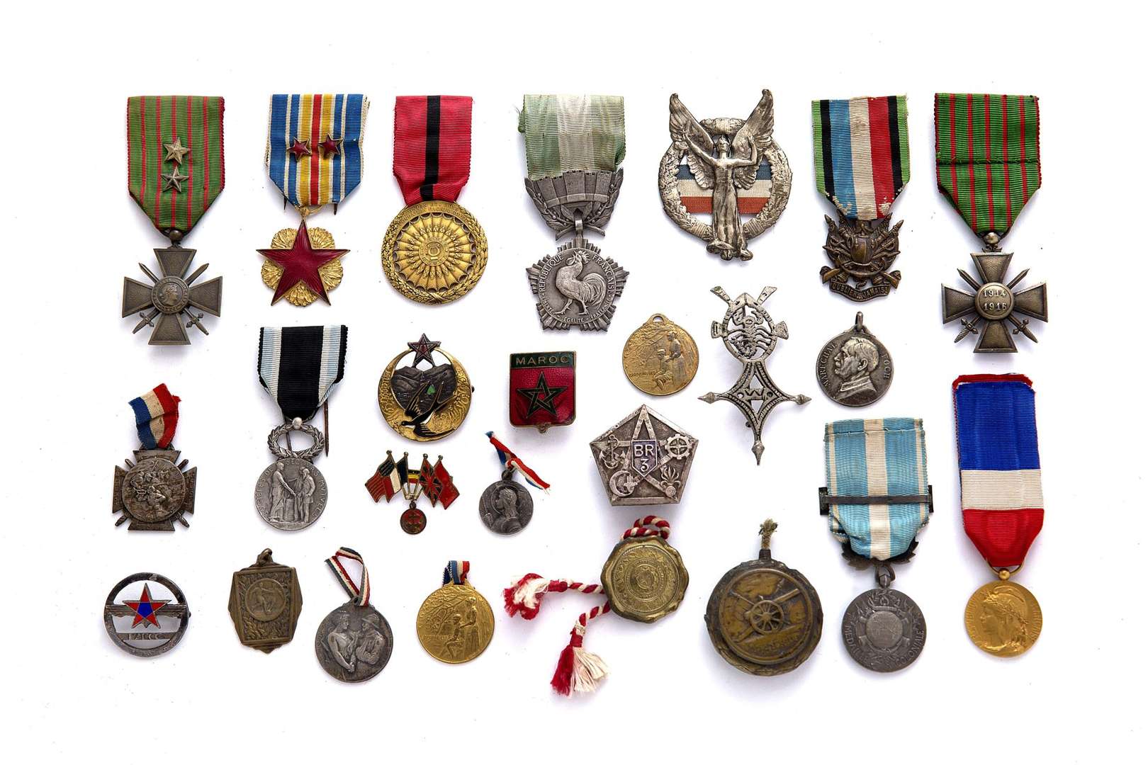 Fort lot de médailles et décorations dont : croix de guerre 14-18 avec palmes et citation, médaille des collectivités locales, médaille commémorative de la guerre de 1870, médailles et insignes commemoratifs de la guerre 14-18 et divers civil.