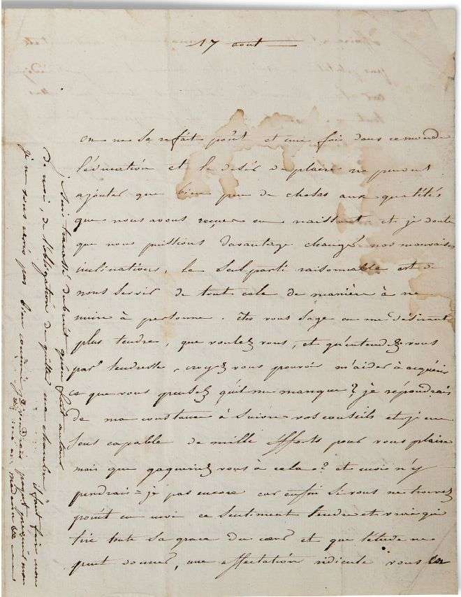 Des travaux vont l'obliger à quitter sa petite chambre | «le petit escalier qui vous conduisait auprès de moi va être entièrement démoli». Il va donc partir à la campagne pour un mois. Il promet à son amie des lithographies pour ses jolies Anglaises. Il termine ardemment : «revenez moi plus belle s'il est possible mais toujours fidèle et gracieuse. Je n'aime pas du tout ces mouvements de sang dont vous me parlez et que vous regrettez de voir inutiles tenez la mer n'est point du tout une chose tranquilisante et toutes ces ardeurs là, mais.... enfin... après tout, j'espère qu'il.... encore et qu'il... rien de mon coté.... anglaises.... venger»