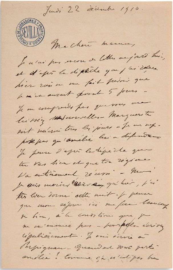 L.A.S. «H.M.», Séville, 22 décembre 1910, à SA MÈRE | 2 pages in-8, en-tête Circulo de Labradores y Propietarios Sevilla.