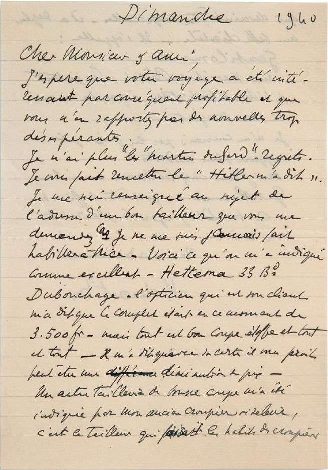 Il espère que son voyage a été intéressant et qu'il n'en rapporte pas de «nouvelles trop désespérantes». Il regrette de ne plus avoir «les Martin du Gard», mais lui fait remettre Hitler m'a dit. Il lui donne des adresses de tailleurs à Nice, qu'on lui a recommandés, «car je ne me suis jamais fait habiller à Nice. Voici ce qu'on m'a indiqué comme excellent : Hettema [...] le complet était en ce moment de 3.500 fr - mais tout est bon, coupe étoffe et tout et tout», ainsi qu'un autre «tailleur de bonne coupe [...] qui faisait les habits des croupiers qui devaient être impeccables - il a de plus une bonne clientèle. Il s'appelle Gentilomme [...]. Je n'en connais pas les prix, je les suppose plus modestes. Moi j'irai chez Hettema - mais le Gentilomme est peut-être suffisant»