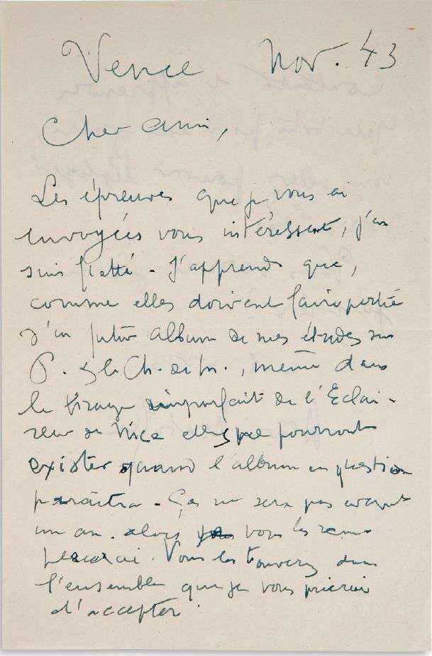 «Cher ami, Les épreuves que je vous ai envoyées vous intéressent, j'en suis flatté. J'apprends que, comme elles doivent faire partie d'un futur album de mes études sur P. & le Ch. de M., même dans le tirage imparfait de l'Éclaireur de Nice elles ne pourront exister quand l'album en question paraîtra. Ça ne sera pas avant un an. Alors je vous les remplacerai. Vous les trouverez dans l'ensemble que je vous prierai d'accepter. Content d'apprendre que votre pied est guéri, vous allez pouvoir déployer vos ailes». Il espère le voir en janvier
