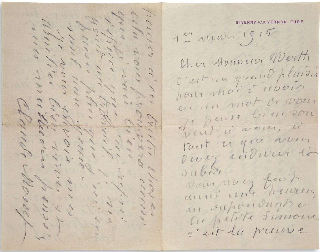 [Léon WERTH (1878-1955) combattait alors dans l'infanterie | Monet l'avait connu grâce à Octave Mirbeau.] «C'est un grand plaisir pour moi d'avoir eu un mot de vous. Je pense bien souvent à vous, à tout ce que vous devez endurer et subir. Vous avez fait aussi une heureuse en répondant à la petite Simone. C'est la preuve que vous avez laissé un bon souvenir à Giverny, et j'espère bien vous y revoir bientôt n'est-ce pas, et avec l'ami MIRBEAU, que je suis allé voir il y a deux jours. Il n'est pas trop mal, en somme, et ces terribles événements lui ont donné une activité d'esprit et d'action, qu'il n'avait pas avant cela. De moi, je peux vous dire que je travaille beaucoup. Cela va vous sembler singulier et j'en ai parfois un peu de honte, travailler pendant que tant d'autres, souffrent, se battent, et meurent, mais c'est pour moi le seul moyen de ne pas trop penser à ces tristes choses. Cela vous prouvera aussi que je vais bien. Depuis que j'ai repris goût au travail, je ne pense plus que j'ai eu mal aux yeux»