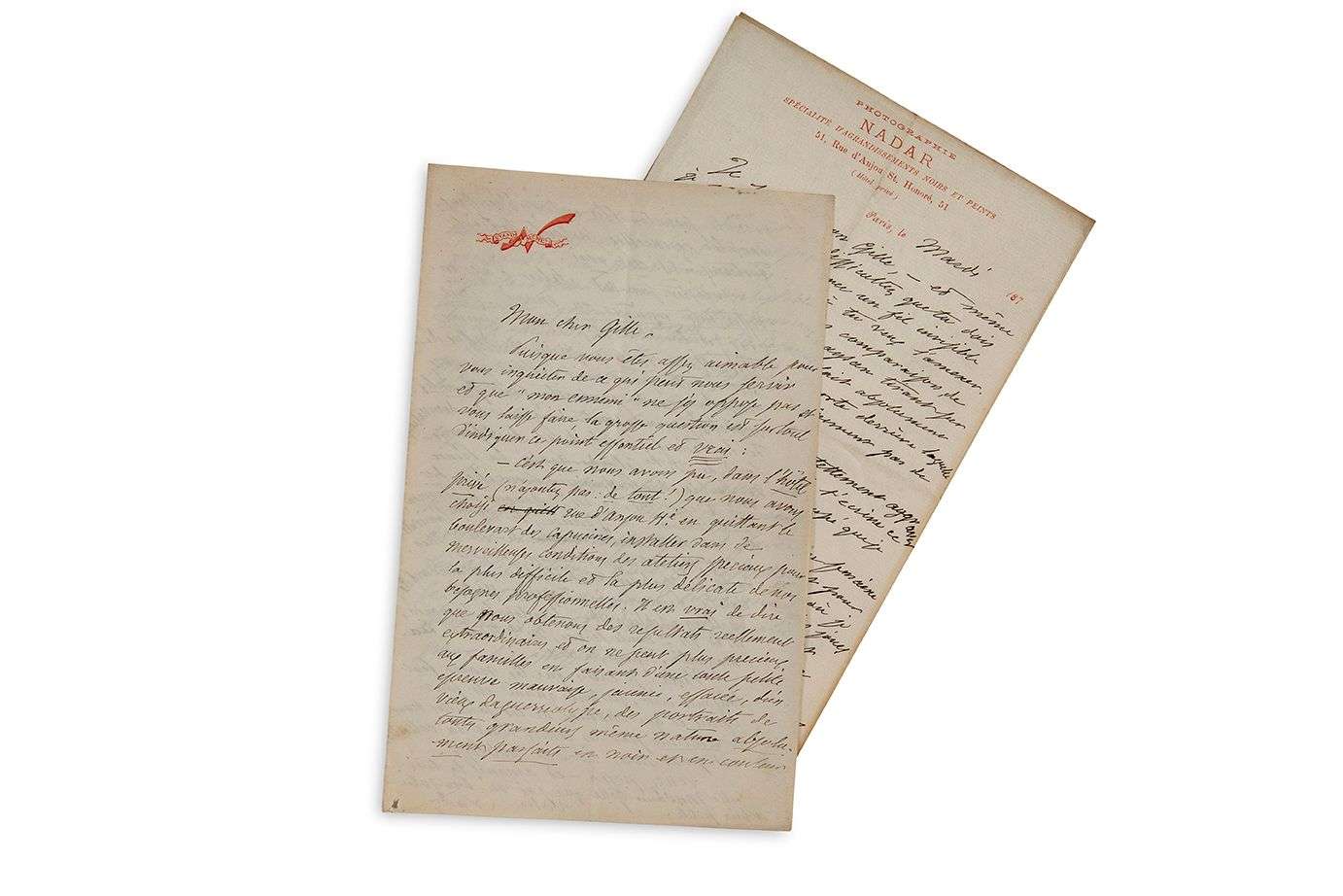 2 L.A.S. «Nadar», [1872 ?] et s.d., à Philippe GILLE | 2 et 3 pages in-8, la 1ère à son chiffre N et devise Quand même !, la 2e à en-tête commercial