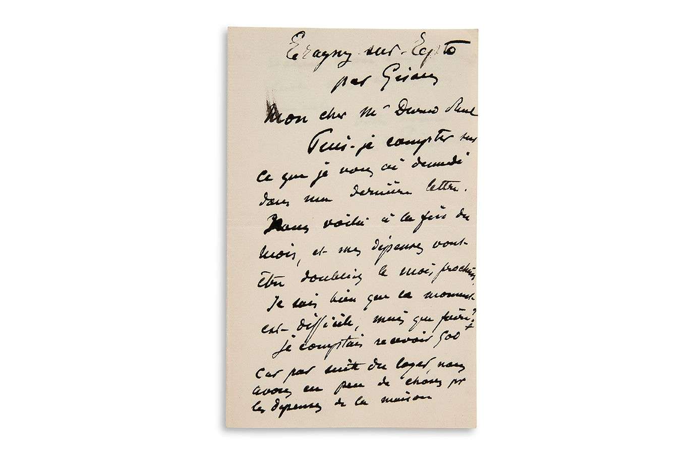 L.A.S. «C. Pissarro», Éragny-sur-Epte par Gisors [vers 1890 ?], à Paul DURAND-RUEL | 1 page et quart in-8.