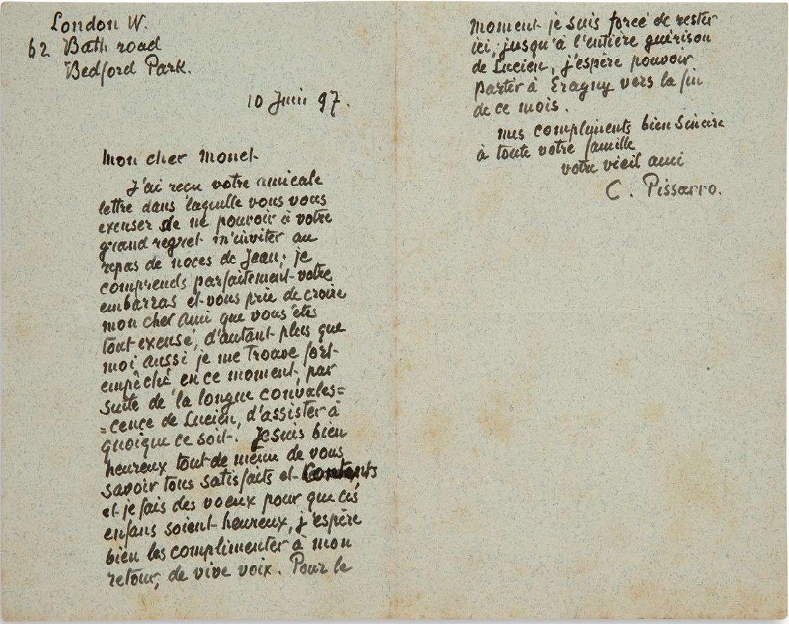 Il comprend l'embarras de Monet, qui n'a pu l'inviter «au repas de noces» de son fils Jean : «moi aussi je me trouve fort empêché, en ce moment, par suite de la longue convalescence de Lucien, d'assister à quoi que ce soit». Il fait des vœux pour le jeune couple. Il reste à Londres «jusqu'à l'entière guérison de Lucien», mais pense pouvoir partir à la fin du mois pour Éragny