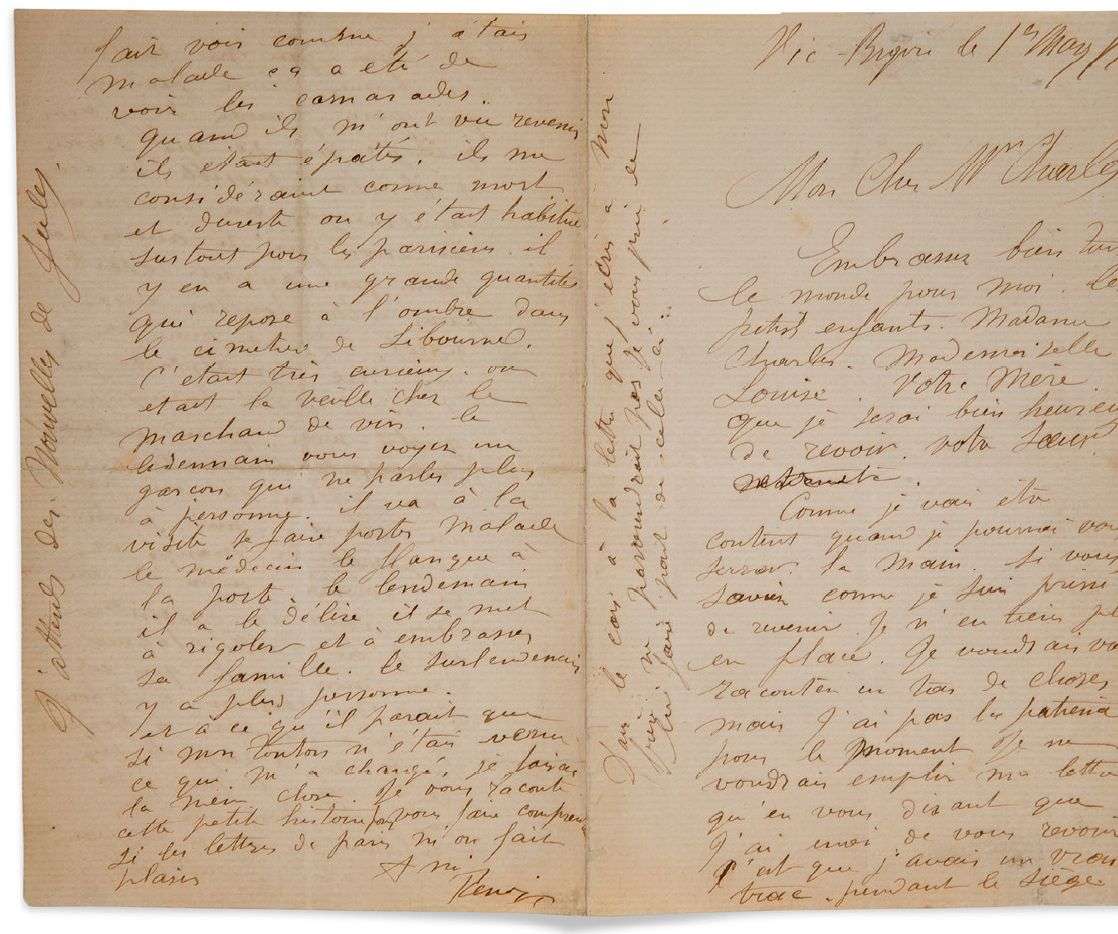 C'est que j'avais un vrai trac pendant le Siège. Et moi qui me collait des bonnes choses pendant que vous creviez de faim. Que de fois je me disais s'il était possible de leur en envoyer un morceau, et moi qui n'avais pas faim qui aurait déserté pour aller souffrir avec vous. [...] j'ai pas été heureux pendant quatre mois, quand je me suis senti sans lettres de Paris. J'ai été pris par un emm....nui, profond, impossible de manger et de dormir | enfin je me suis payé la dyssenterie et j'ai failli claquer sans mon oncle qui est venu me chercher à Libourne et m'a emmené à Bordeaux. Là ça m'a rappelé un peu Paris. Et puis j'ai vu autre chose que des militaires ce qui m'a remis vite, et ce qui m'a fait voir combien j'étais malade ça a été de voir les camarades. Quand ils m'ont vu revenir ils étaient épatés, ils me considéraient comme mort et du reste on y était habitué surtout pour les parisiens. Il y en a une grande quantité qui repose à l'ombre dans le cimetière de Libourne».