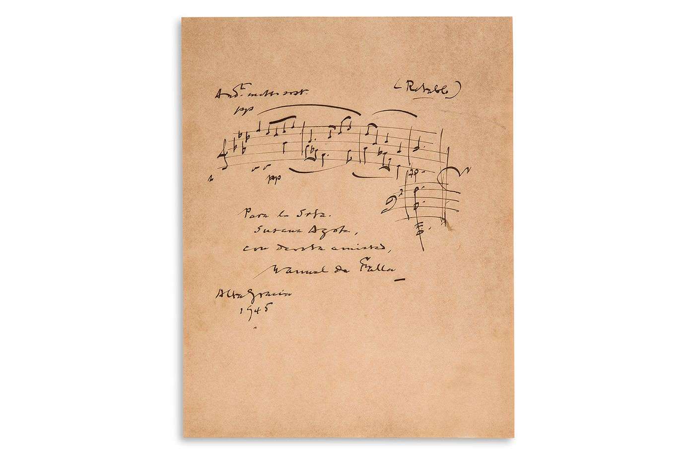 Belle page d'album écrite lors de son exil en Argentine, à Alta Gracia où il décédera l'année suivante. Falla a inscrit 4 mesures sur une portée (la dernière sur 2 portées avec l'accord final) de son Retablo de Maese Pedro (Les Tréteaux de Maître Pierre, 1922), avec l'indication