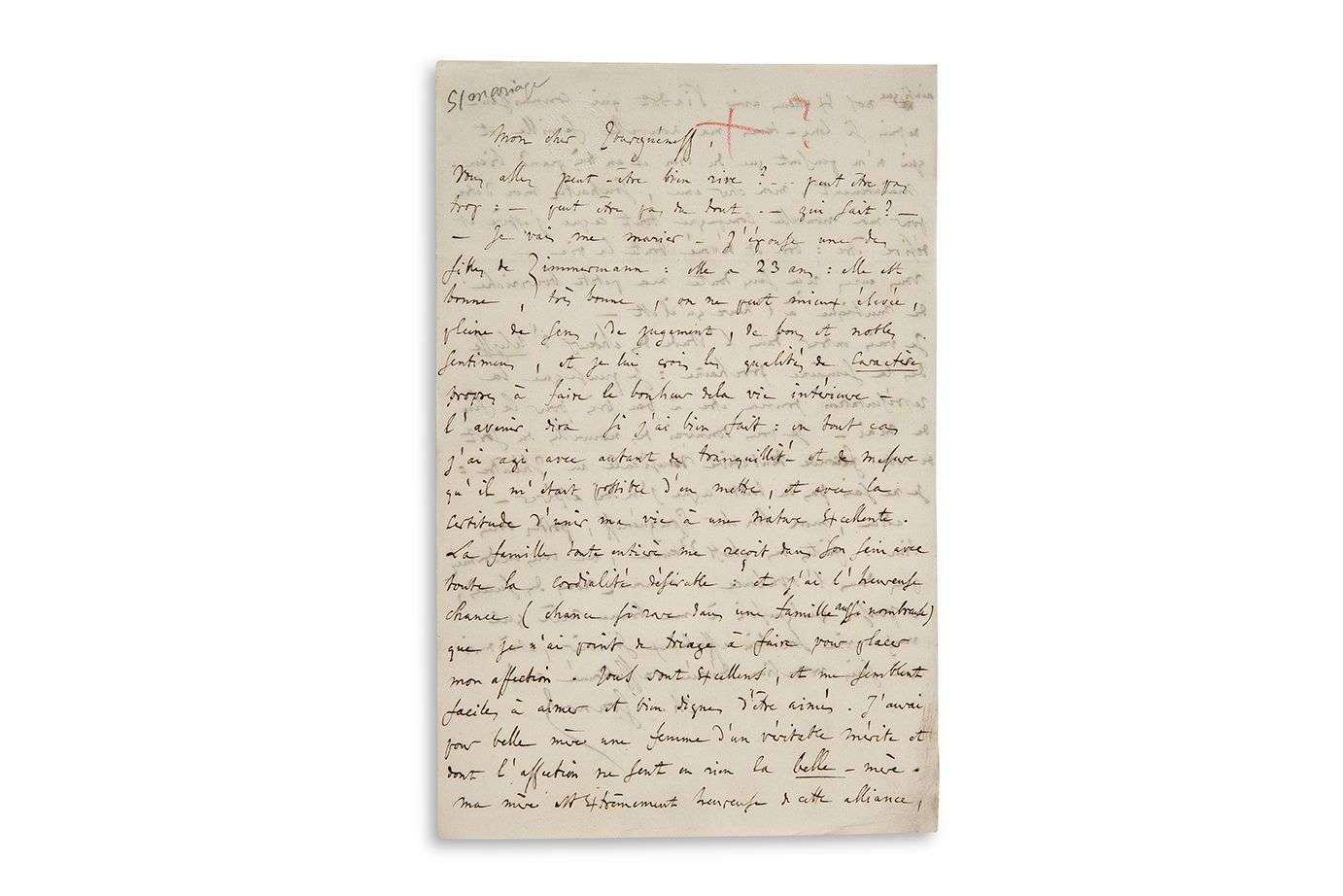 «Vous allez peut-être en rire ? [...] Je vais me marier. J'épouse une des filles de ZIMMERMANN : elle a 23 ans, elle est bonne, très bonne, on ne peut mieux élevée, pleine de sens, de jugement, de bons et nobles sentiments, et je lui crois les qualités de caractère propres à faire le bonheur de la vie intérieure - l'avenir dira si j'ai bien fait : en tout cas j'ai agi avec autant de tranquillité et de mesure qu'il m'était possible d'en mettre, et avec la certitude d'unir ma vie à une nature excellente. La famille toute entière me reçoit dans son sein avec toute la cordialité désirable. [...] J'aurai pour belle-mère une femme d'un véritable mérite [...] Ma mère est extrêmement heureuse de cette alliance, ainsi que nos excellents amis VIARDOT qui connaissent depuis si longtemps ma nouvelle famille et qui n'en pensent que du bien et un très grand bien»... Il espère que Tourgueniev a bien reçu «ma petite bourriche de musique»... La semaine prochaine, il va entrer dans «l'étude des chœurs d'Ulysse», espérant que la représentation aura lieu fin mai : «Je vous donnerai des nouvelles du sort de cette seconde tentative musicale au théâtre : je ne sais pas du tout ce que je dois en espérer». Il lui dit adieu, l'engageant à faire des chefs d'œuvre : «ne vous endormez pas dans l'opulence : annoncez-nous des succès»... [Le 31 mai 1852, Gounod épousera Anna ZIMMERMAN, l'une des filles du célèbre professeur au Conservatoire. Entretemps, à la suite de ragots, les Zimmerman avaient obligé Gounod à renvoyer à Pauline