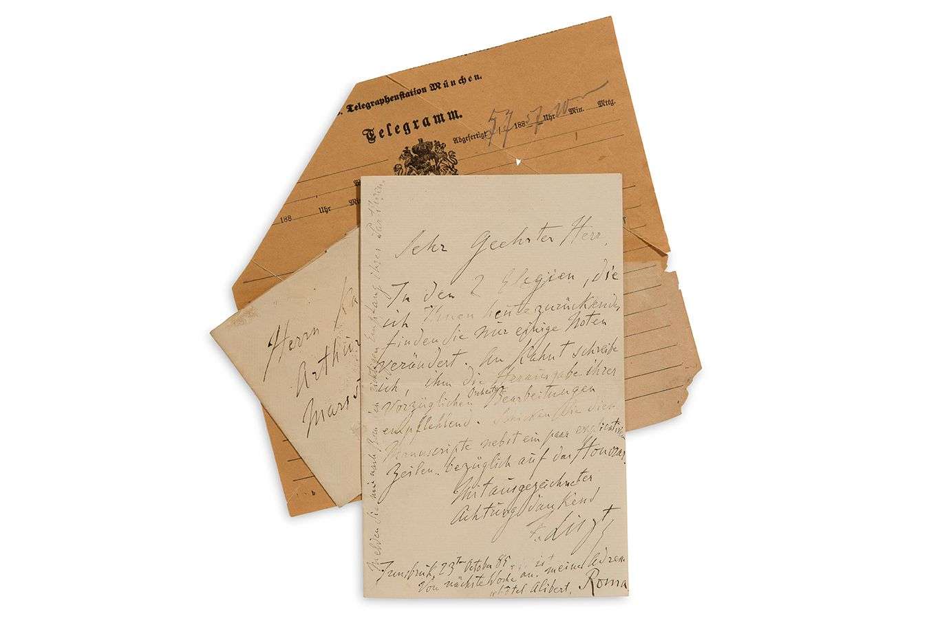 Il écrit à Kahnt pour recommander la publication de ces excellents arrangements orchestraux («An Kahnt, schreibe ich, ihm die Herausgabe ihrer vorzüglichen Orchester Bearbeitungen empfehlend. Schicken Sie diese Manuscripte nebst ein paar explicativen Zeilen bezüglich auf das Honorar»). Il part la semaine suivante pour Rome, où il sera à l'Hôtel Alibert, et où il demande de lui annoncer le bon accueil de ces partitions. On joint un télégramme