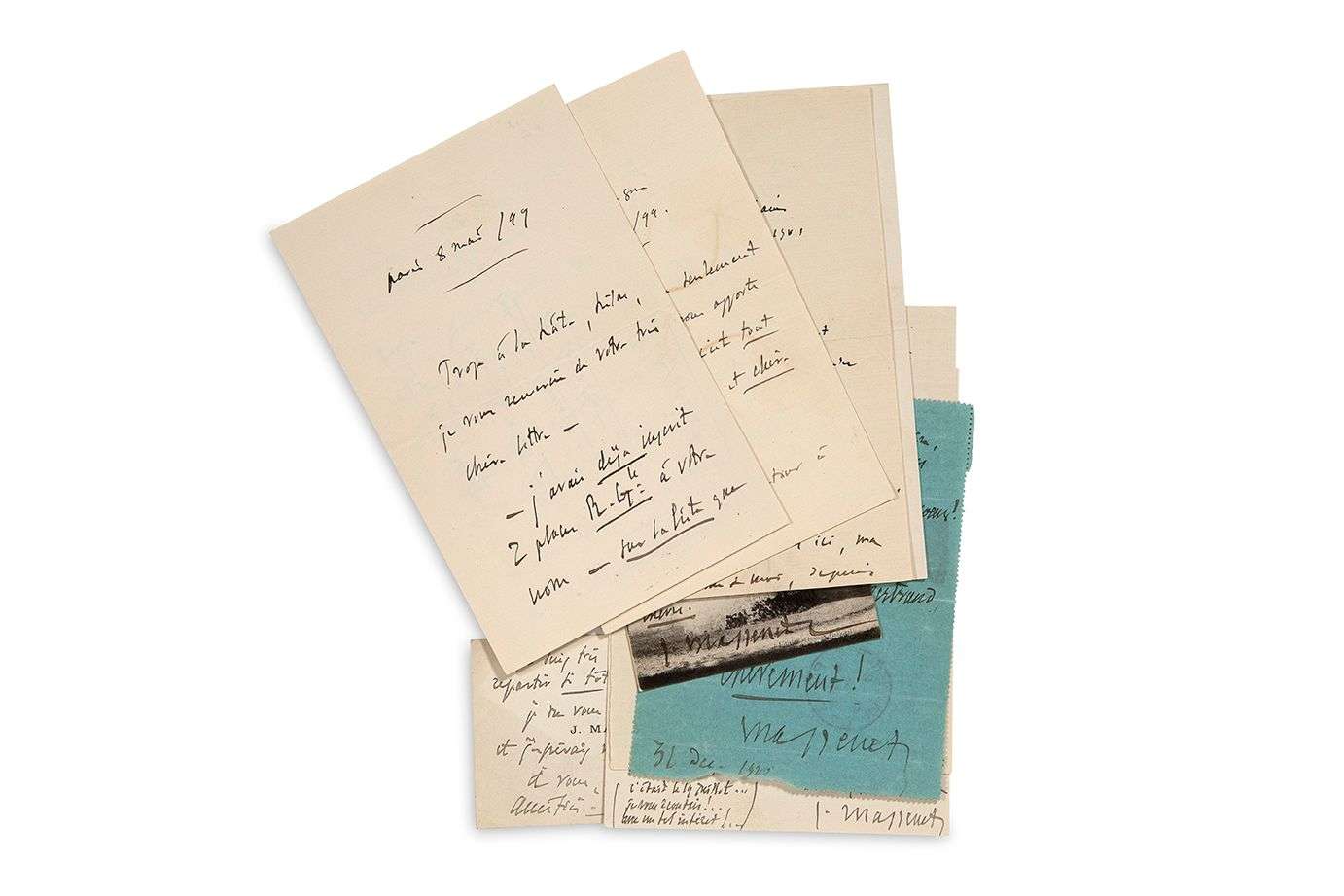 8 et 22 mai 1899, à Mme Costallat : elle est bien inscrite pour la répétition générale [de Cendrillon] | il promet de lui envoyer «votre partition mise de côté - pour vous !»... Aix-les-Bains 16 mai 1901, à la même, sur sa cure avec sa femme | «je ne mets jamais “un œillet” à ma boutonnière sans me figurer qu'il me vient de vous»... 18 mars 1905, recommandant à un directeur le «maître André Tapponnier», pour la place de chef d'orchestre... 29 juillet (sur carte postale d'Égreville) et 31 décembre 1910, à Marcel BERTRAND : «je comprends qu'une âme comme la vôtre sente et écrive la paisible musique qui est celle que j'ai entendue» | le remerciant «pour l'intime joie que vous me donnez ! Votre pensée, vos paroles vont à mon cœur !»... Compliments, souvenirs affectueux, etc