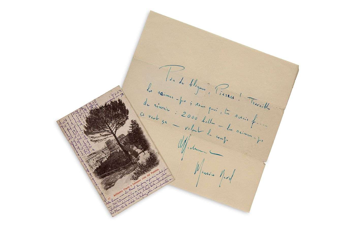 On joint une carte postale a.s. de Florent SCHMITT à Ravel, [Rome 14 juin 1901] : «Mille bravos mon cher Ravel. Vous pensez si je suis content pour vous. Dites à Ducasse qu'il ne se désole pas car son tour viendra infailliblement puisqu'il a du talent. Surtout de la modération (comme dit Ibsen) dans la cantate. Vous la ferez jolie, c'est impossible autrement, mais qu'avant tout elle soit claire et saisissable du premier coup, sans pour cela banale»...