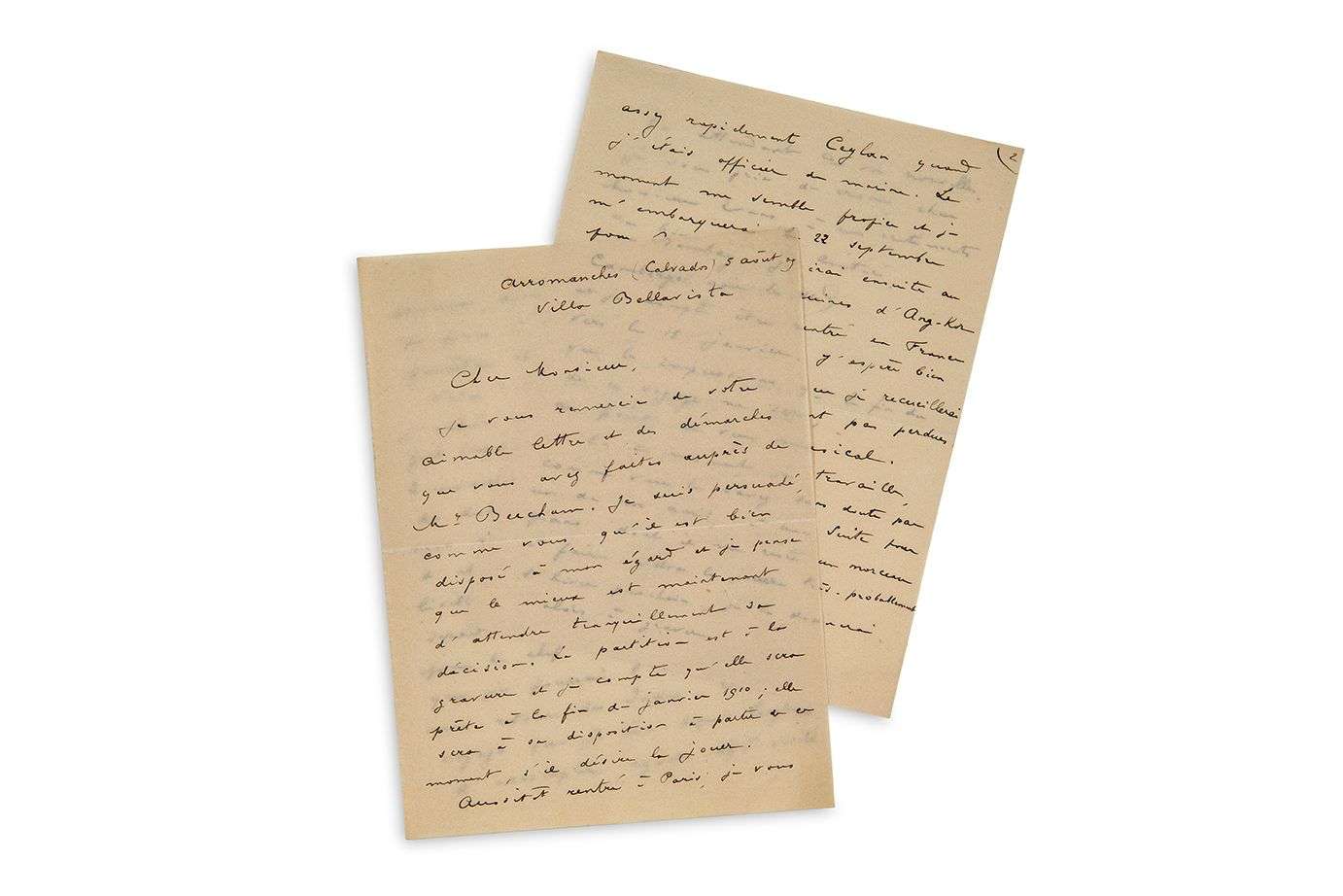 L.A.S. «Albert Roussel», Arromanches 5 août [19]09, à Edwin EVANS | 3 pages et demie in-12.