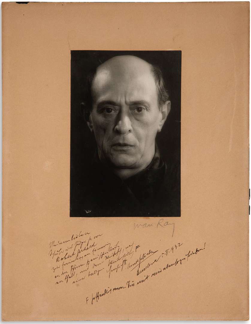 Rare photographie de Schönberg par Man Ray, signée par le photographe et dédicacée par Schönberg à son disciple espagnol