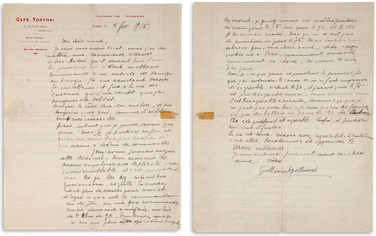 L.A.S. «Guillaume Apollinaire», Nîmes 4 février 1915, [à son amie Louise FAURE-FAVIER] | 2 pages in-4 à en-tête du Café Tortoni (petites fentes aux plis réparées, petite jaunissure).