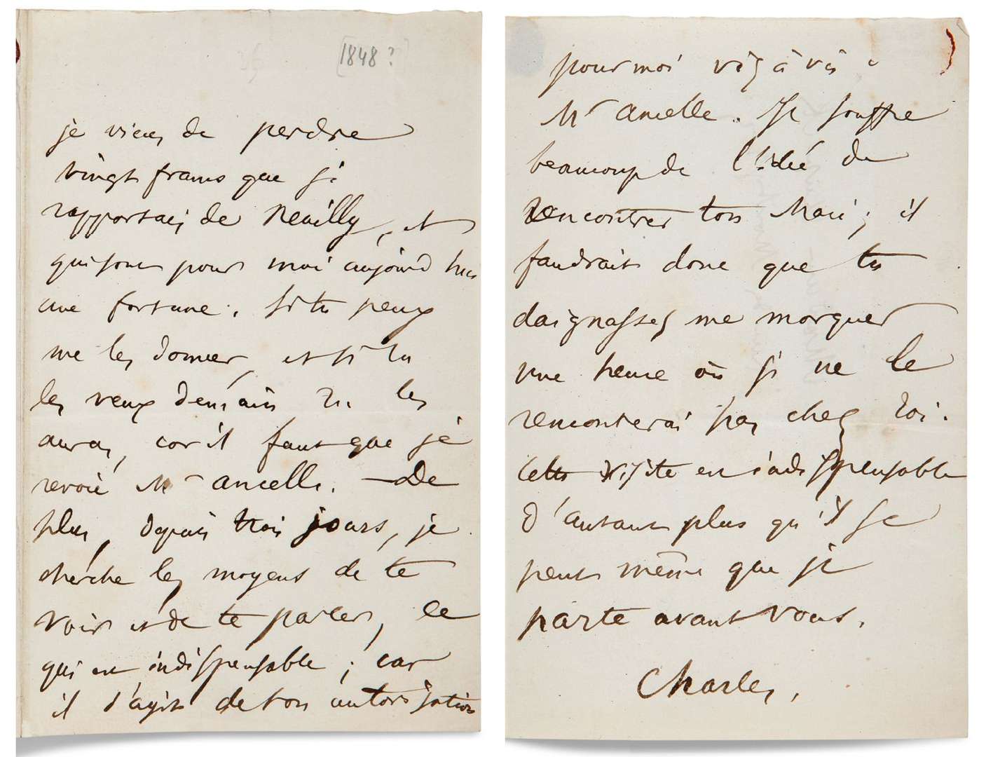 L.A.S. «Charles», [Paris fin avril ou début mai 1848 ?], à SA MÈRE Madame AUPICK rue des Martyrs | 2 pages in-8, adresse.