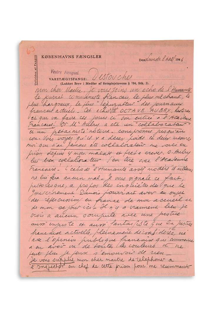 L.A.S. «LF Destouches», [Prison de Copenhague] 8 avril 1946, à son avocat Thorvald MIKKELSEN | 2 pages in-4 sur papier rose à en-tête de la prison Københavns Fængsler, Vestre Fœngsel.