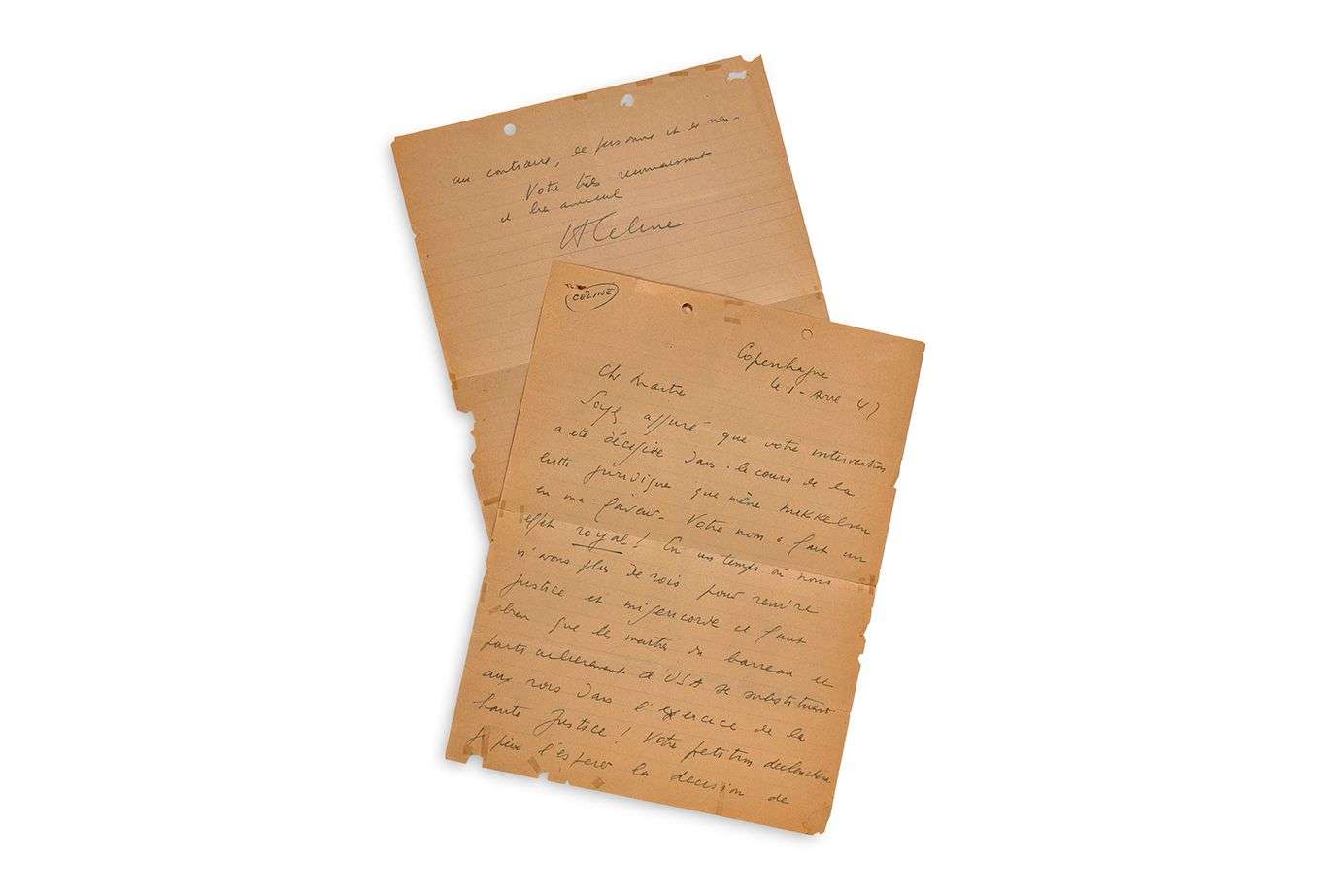 L.A.S. «LFCeline», Copenhague 1er avril 1947, [à Milton HINDUS] | 3 pages et demie in-4 sur papier avec trous de classeur (papier jauni, bords effrangés et petites fentes réparées).