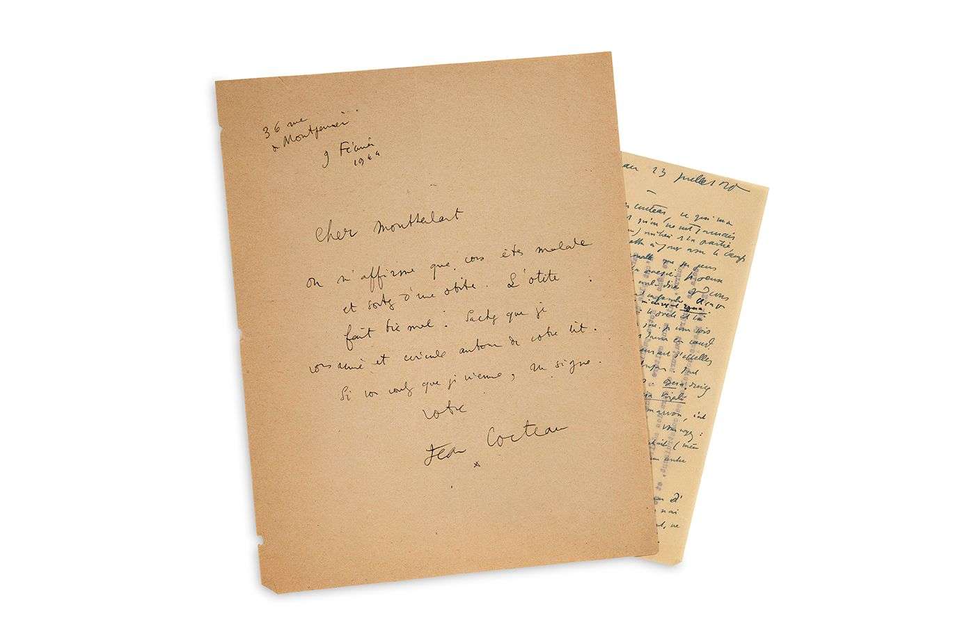 On joint le brouillon autographe d'une lettre d'Henry de MONTHERLANT à Cocteau, 23 juillet 1940 (1 p. in-8) : «ce qui m'a dégoûté du sport, est qu'on ne voit jamais une équipe, au (beau) milieu de la partie, se mettre à jouer avec le camp ennemi. Preuve nouvelle que ces gens n'entendent rien à la poésie»