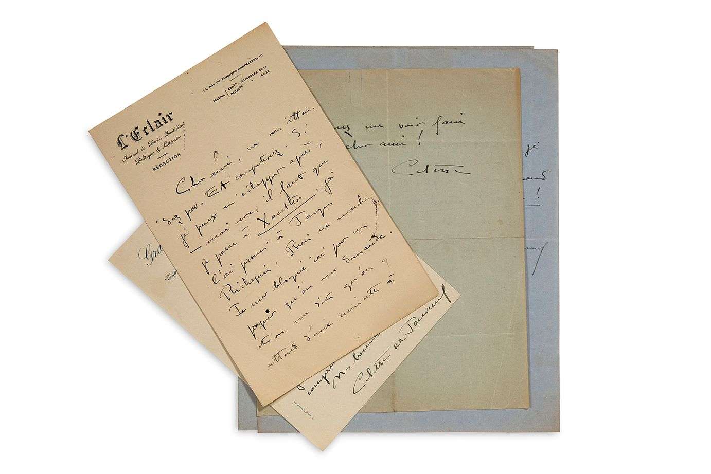 5 L.A.S. «Colette de Jouvenel» (3) et «Colette», à l'avocat et homme de lettres Adrien PEYTEL | 2 pages in-8 à en-tête du journal L'Éclair, 1 page in-8 à en-tête du Grand Hôtel de Noailles Métropole Marseille, et 2 pages et demie in-4.