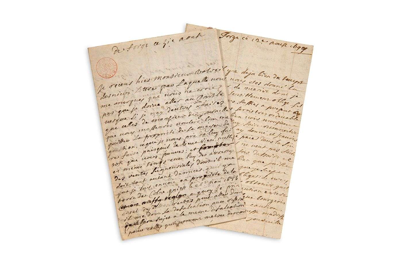 2 L.A.S. «Corneille», Forge 4 et 12 août 1697, à MM. de PRETOT | 3 pages in-8 chaque avec adresse et petit cachet de cire rouge (cachet de collection).