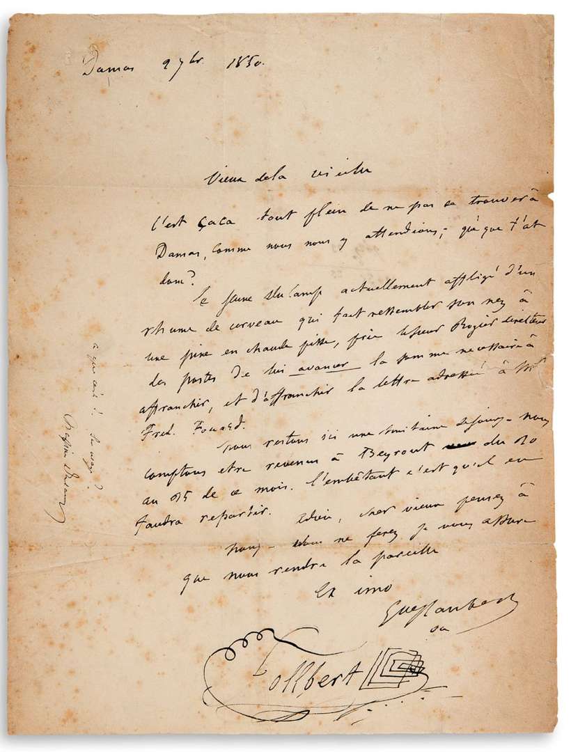 «Vieux de la vieille C'est caca tout plein de ne pas se trouver à Damas, comme nous nous y attendions | qué que t'at donc ? Le jeune Du Camp actuellement affligé d'un rhume de cerveau qui fait ressembler son nez à une pine en chaude pisse, prie le sieur Rogier directeur des postes de lui avancer la somme nécessaire à affranchir, et d'affranchir la lettre adressée à Mr Fréd. Fouard. Nous restons ici une huitaine de jours. Nous comptons être revenus à Beyrout du 20 au 25 de ce mois. L'embêtant c'est qu'il en faudra repartir»... La seconde signature «Follbert» est ornée de paraphes fantaisistes.
