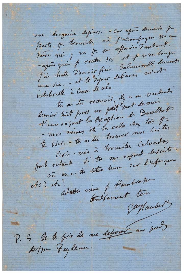 Quant à moi j'ai repris mon assommant chapitre XII ! plein d'explications politiques & de petites choses au 3e plan. - Ce qui fait que j'écris encore plus lentement que d'habitude. Puis je vais être dérangé pendant une douzaine de jours. - Car après-demain je parts pour Trouville où j'accompagne ma mère qui y va pour ses affaires d'intérêt. - Après quoi je rentre ici et je n'en bouge. J'ai hâte d'avoir fini. Salammbô devient une scie. - Et le séjour de Paris m'est intolérable à cause de cela»...