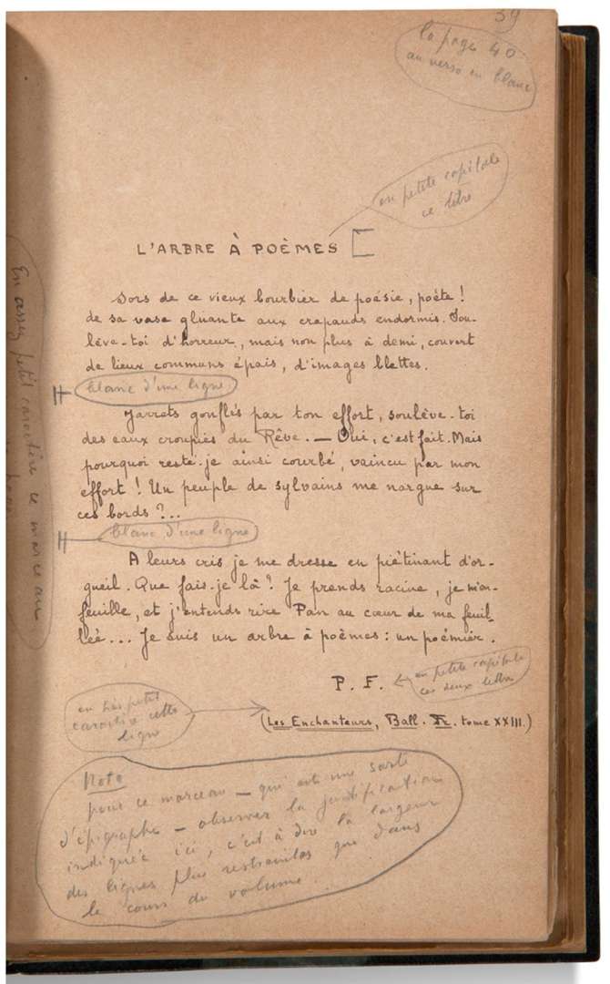 MANUSCRIT autographe signé «Paul Fort», L'Arbre à poèmes, [1922] | un volume in-8 de 133 pages autographes et 74 pages imprimées en épreuves et corrigées, reliure demi-maroquin vert à coins, dos à nerfs, tête dorée (Bernasconi).