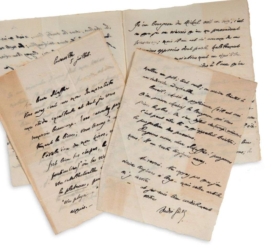 Gide remercie Scheffer (qui vient de publier dans La Plume du 1er juillet 1902 un élogieux article sur L'Immoraliste) : «Vous racontez parfaitement le livre | vous tracez à souhait l'évolution de mon héros, en marquez fort bien les étapes, le moment (en particulier) “où la vie physique et la vie intellectuelle s'équilibrent en lui”, le plateau, puis aussitôt après, la “vie physique” l'emportant, par élan acquis». Il se justifie des reproches qu'on lui a adressés d'avoir fait son héros malade, puis rectifie un propos de Scheffer : “la littérature, le consolant...etc.” | non : je ne pense pas que Michel puisse jamais écrire. Sa chaleur, vous le sentez bien, n'est qu'ardeur | elle brûle sans réchauffer | les mots se friperaient sous sa plume. Croyez bien cher Scheffer que ce n'est que parce que je ne suis pas Michel, que j'ai pu raconter son histoire aussi “remarquablement bien” que vous le dites. - Mais cela vous le savez, et le Je, que je me suis trouvé contraint d'employer, ne trompera que les imbéciles qui ont besoin, à la fin d'un René qu'un Chactas vienne leur montrer que : si René est dans Chateaubriant, Chateaubriant n'est pas tout entier dans René, non plus que Benjamin Constant tout dans Adolphe, non plus que Gœthe tout dans Werther». Il reconnaît cependant qu'il y a en lui un peu de son héros, mais est ainsi amené à définir la littérature : «Que de bourgeons nous portons en nous, cher