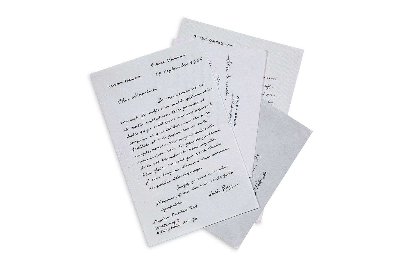 8 L.A.S. «Julien Green», 1986-1989, à Adelbert REIF à Munich | 10 pages in-8 ou in-12, dont quelques cartes à son nom, 2 enveloppes.