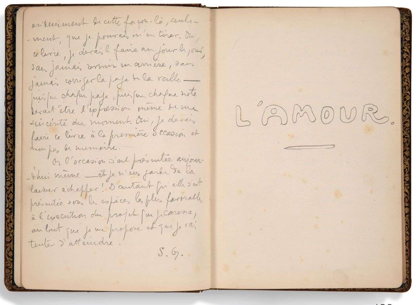 MANUSCRIT autographe signé «S.G.», L'Amour, [vers 1930 ?] | un volume in-8 de 17 pages au crayon et une à l'encre (le reste vierge), relié basane maroquinée vert foncé (dos passé), tranches dorées (étiquette